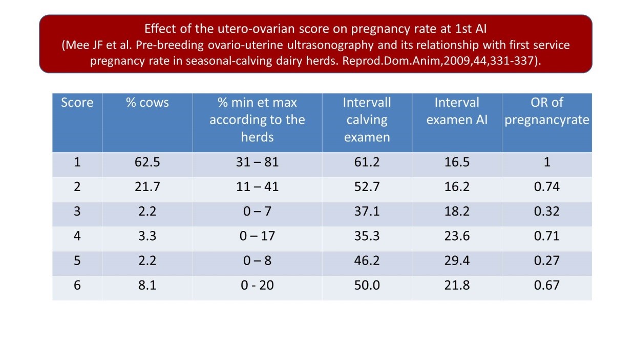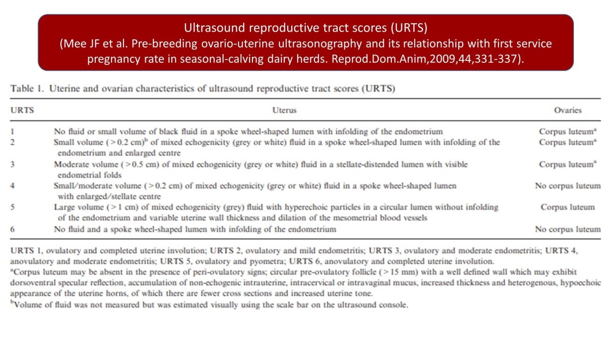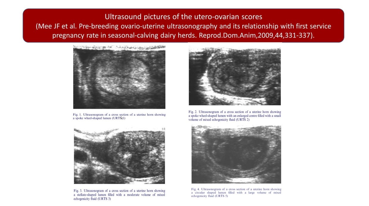 REFERENCE :  Mee JF, Buckley F, Ryan D, Dillon P. Pre-breeding ovaro-uterine ultrasonography and its relationship with first service pregnancy rate in seasonal-calving dairy herds. Reprod.Dom.Anim,2009,44,331-337.
