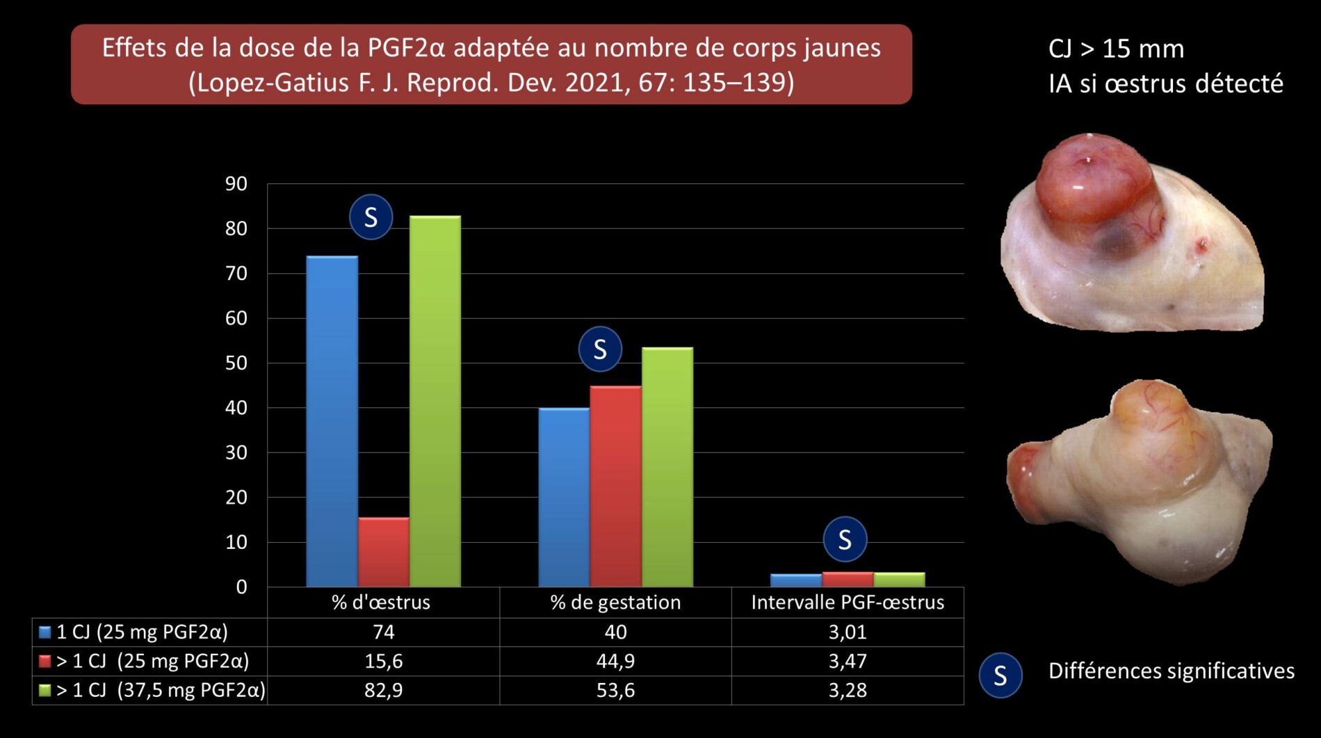 L’injection d’une PGF2α ne s’improvise pas. Il convient de vérifier, par échographie idéalement, non seulement la présence d’un CJ de diamètre > 15 mm mais également le nombre. L’identification de plus d’un CJ associée à une production laitière > 45 kg doit nous inviter à multiplier par 1,5 la dose de PGF2α habituellement utilisée.