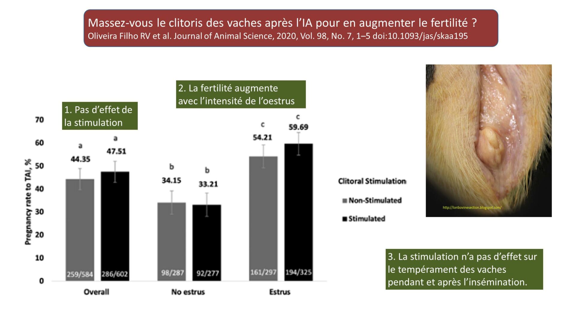 REFERENCE : Oliveira Filho RV et al. The effect of clitoral stimulation post artificial insemination on pregnancy rates of multiparous Bos indicus beef cows submitted to estradiol/ progesterone-based estrus synchronization protocol. Journal of Animal Science, 2020, Vol. 98, No. 7, 1–5 doi:10.1093/jas/skaa195