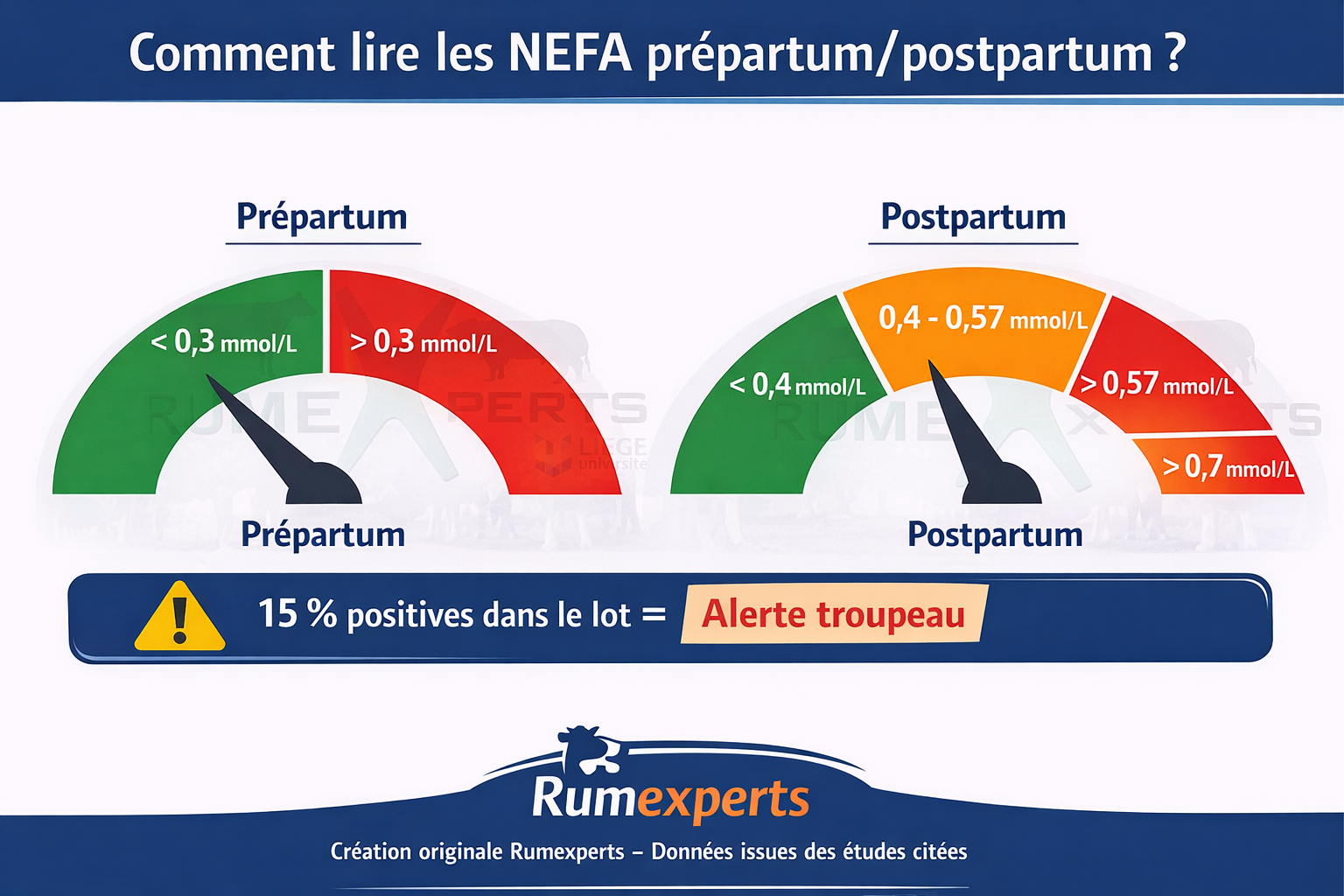 - NEFA postpartum ≥ 0,57 mmol/L : seuil de vigilance pratique crédible, à interpréter selon le jour postpartum. (Seuil reco RumeXperts <0,45 mmol/L)