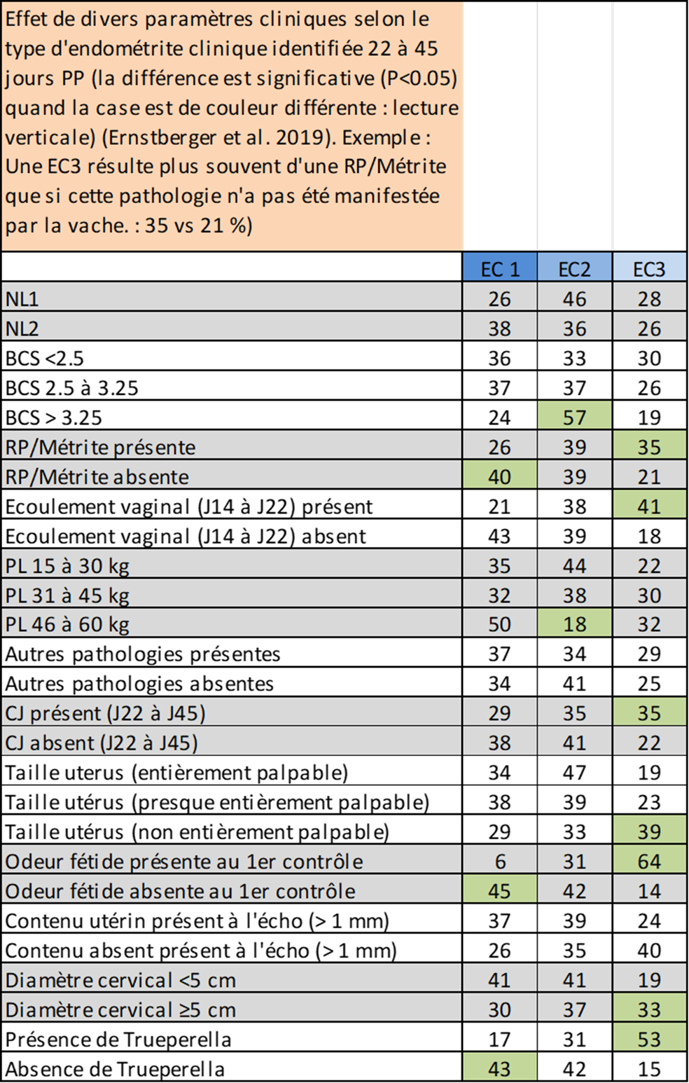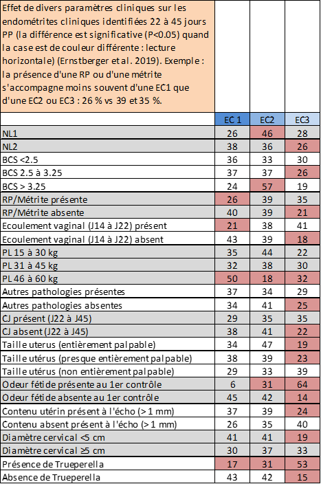 Ainsi la fréquence de 46 % des endométrites de degré 2 est chez les primipares significativement plus fréquente que celle des endométrites de degré 1 ou 3. Un score corporel < 2.5 ne s'accompagne d'aucune différence de la fréquence du type d'endométrites. En l'absence de corps jaune, l'endométrite de degré 3 est moins fréquente que les deux autres. L'identification d'une odeur fétide renseigne sur la présence d'une endométrite de degrés 2 ou 3. De même l'identification de Trueperella est plus souvent observée en cas d'endométrite de degré 3. Il est par contre surprenant de constater que l'identification échographique d'un contenu utérin de diamètre > 1 mm est moins souvent observée dans l'endométrite de degré 3.
