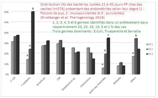 Le TROISIEME INTERET de cette étude est de décrire le contenu bactériologique des vaches atteintes d'endométrites en fonction de leur degré. Trois germes ont été isolés en culture pure à savoir E Coli, Trueperella et Serratia. On observe également que plusieurs germes sont le plus souvent isolés. Trueperella constitue un facteur de risque majeur d'identifier une endométrite clinique de degré 3.